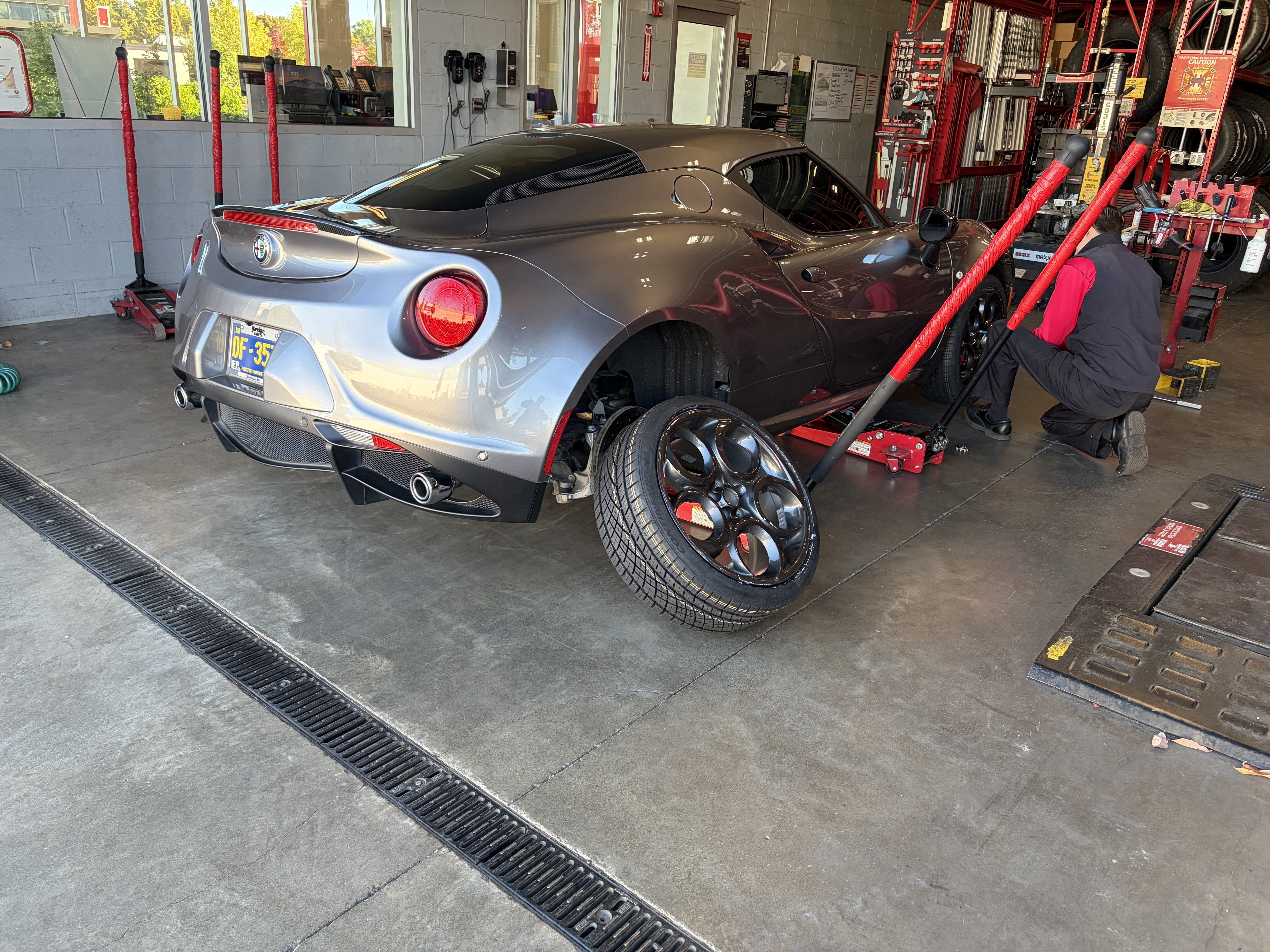 Replaced the factory tires with 9,800 miles on them today. The tire shop did one side of the car at a time using the correct lift points. They did a great job.